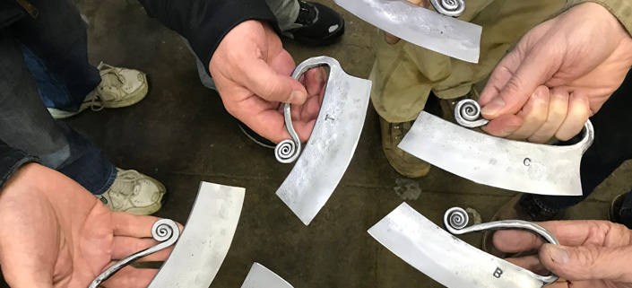 In this fun class, you will forge a 6-inch, rocking knife out of a high-carbon steel bar, stamp it with your initials, clay-harden it to produce a Japanese-style differential heat treatment, temper it, and hand-hone it to a razor sharpness on a water stone. Rocking knives are very useful for chopping and mincing herbs and vegetables; it also works great for slicing pizza and cutting up chicken. The knife is unique in that the blade and handle are forged from a single piece of steel, which is aesthetically pleasing while providing a great learning opportunity in manipulating hot steel. The photo represents the knife you will be making. The class will also cover the ergonomic forging method, and the theory and practice of heat-treating steel. The knife, and anything else you make is yours to take home.